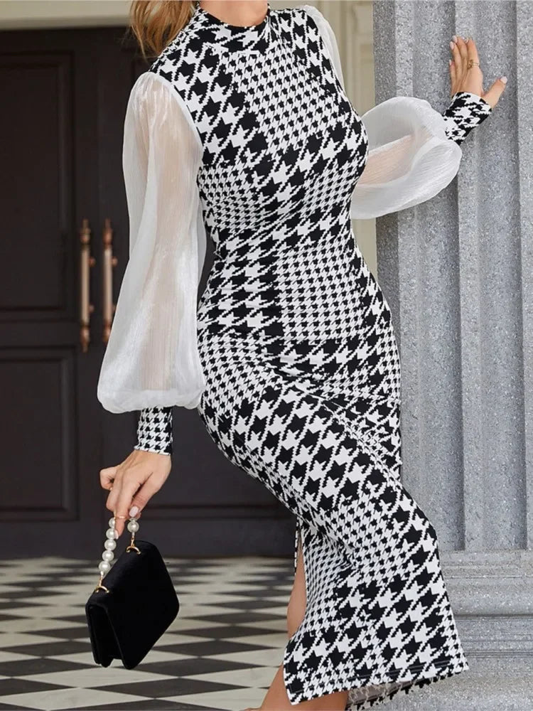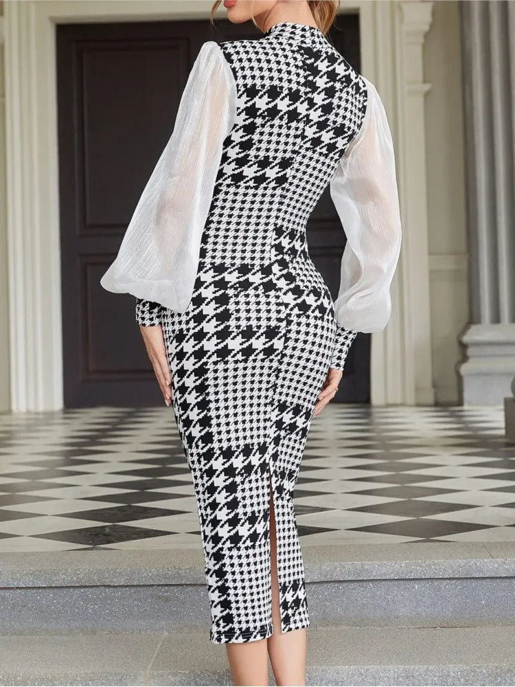 The Althea Houndstooth Mesh Midi Dress — elegance redefined for the modern woman.