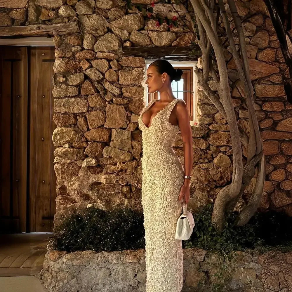 Unveil your radiance in the Mimi Bloom—a masterpiece of elegance and allure. This V-neck see through maxi dress hugs your curves with sensual precision, while delicate floral appliqués bloom across the sheer fabric, creating an ethereal silhouette that’s both bold and romantic.