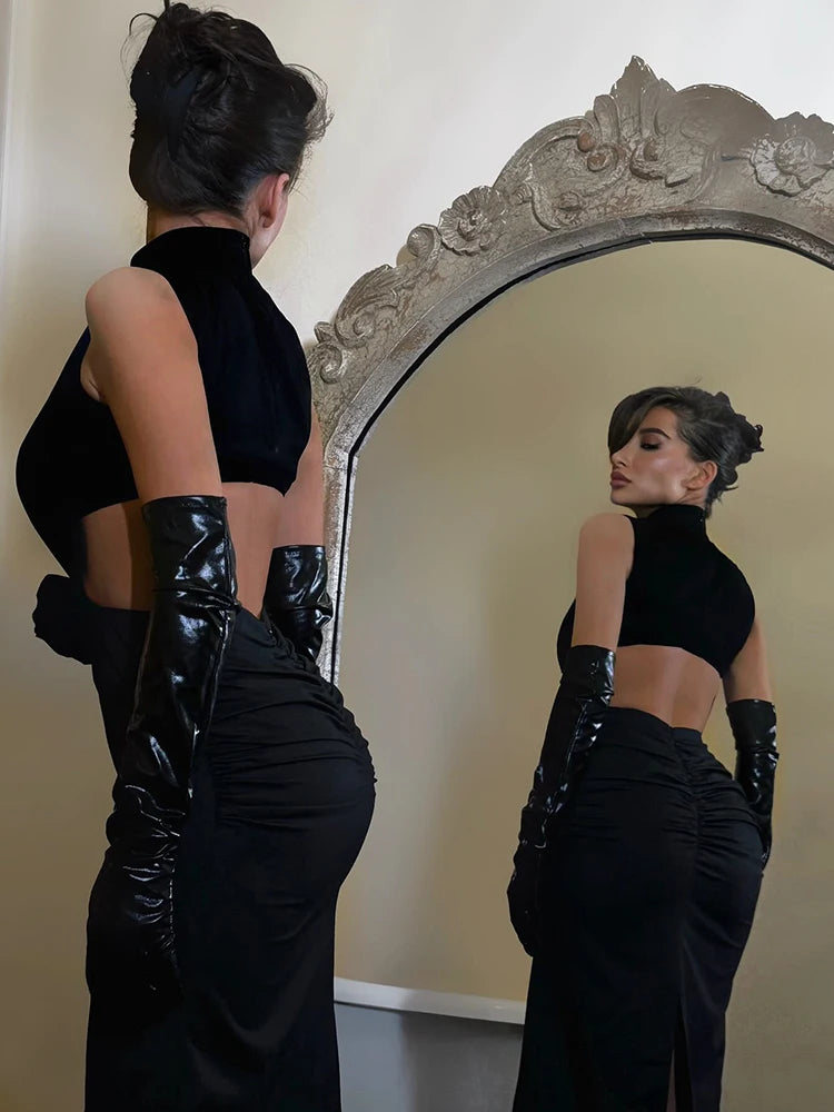 The Selene Cut-Out Maxi is designed to celebrate form and confidence, with elegant cut-out detailing, a sleeveless silhouette, and a curve-hugging fit. Crafted in a solid tone that radiates quiet strength, this is the dress for moonlit moments and powerful entrances.